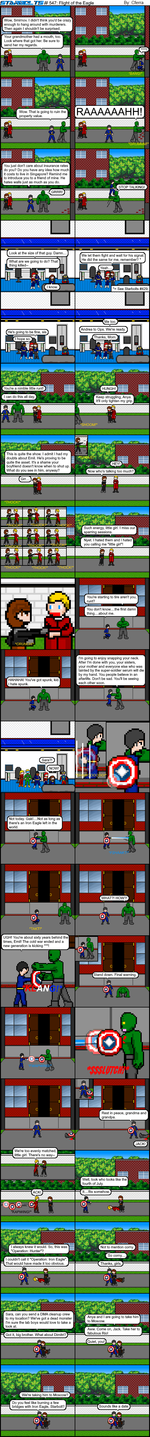 Well, this is an interesting turn of events. It looks like Jack has decided to finally embrace his heritage and become Iron Eagle after all. When he met his grandfather in Starbolts #504, he was adamant in refusing to pick up the shield. What happened? What changed? I’ll explain why in future comics. Right now Dimitri has to be delivered to Moscow. It doesn’t take a lot to imagine what his superiors are going to do to him. Suffice it to say Dimitri’s debriefing will be quite unpleasant. At least the monster that killed the first Iron Eagle and Spitfire is dead and their spirits can rest easy knowing it can no longer threaten the world and their daughter, grandchildren and unborn great-grandchild.
