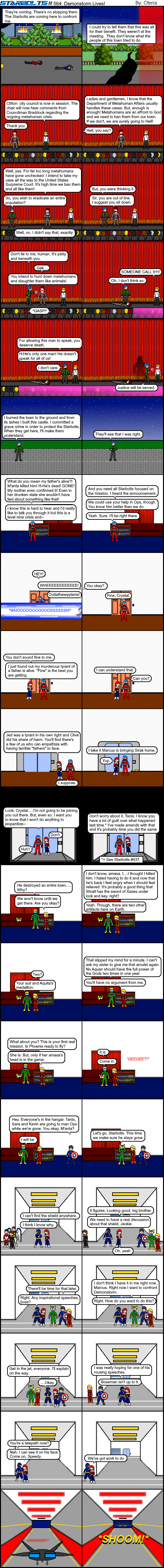 Well, now. Demonstorm is back and he still has his twisted idea of what a hero should be. If you remember from the Starbolts “tournament” comics which ran from Starbolts #153 to Starbolts #200, Demonstorm had this crazy idea that he should be the hero. The thing is though at heart he is an evil, evil tyrant with none of the morality which makes a person a hero. He goes about it all wrong and now thousands are dead because of his misguided beliefs. Charming, isn’t he?