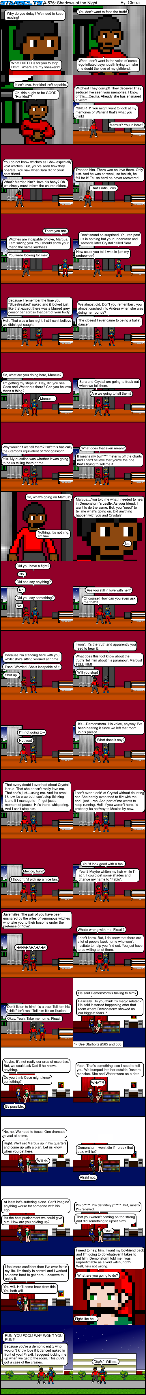 I picked Pat Benatar’s “Shadows of the Night” as a title because it seemed appropriate to what’s happening with Speedy. Take her hand, Marcus. You’ll be alright! Demonstorm is clearly the shadow of the night here. He has no concept of “love” in his heart. He’s going to learn that he definitely picked the wrong Starbolt to possess!!