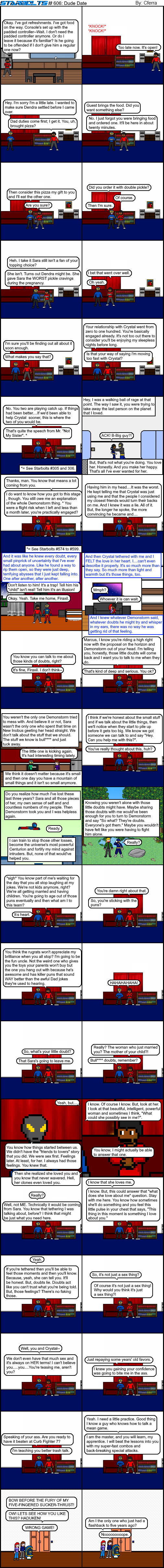 There’s nothing quite like having two guys talk about life, the universe and everything and then proceeding to beat each other up in a Street Fighter-like game, right? The friendship Firaxil and Marcus have go back to when they were teens and they are still best friends to this day. Firaxil wanted to know why Marcus suddenly felt better about everything and he gave him the details. Marcus and Crystal tethered and no it’s not just a sex thing. The tethering allowed them to see their love as I’ve explained in other comics. Here’s hoping Firaxil and Sara do it as well. It might alleviate the doubts our Inobe friend might have about his wife.
