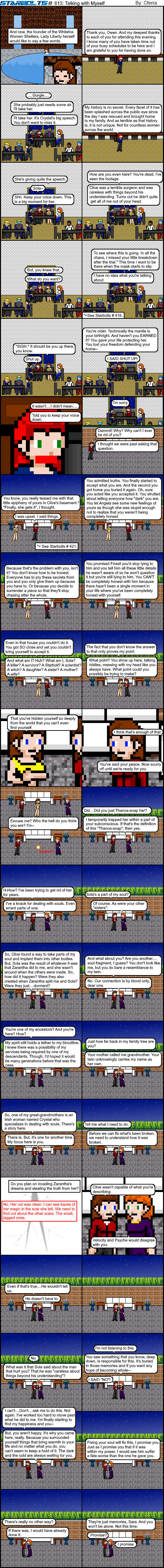 Now, what about Sara? Well, she’s going to have to take a trip down memory lane isn’t she? I’ve already referenced her trial in Starbolts #416 and the basement scene in Starbolts #421.She has a long road of recovery ahead of her and I am confident she will emerge from all of this a whole new person with a complete soul and everything. How do I know? The power of advanced plot points! It’s handy to have. I can’t say how it will be accomplished. But, have patience because it is going to be a wild ride. And don’t worry. I haven’t forgotten the snake at the academy.