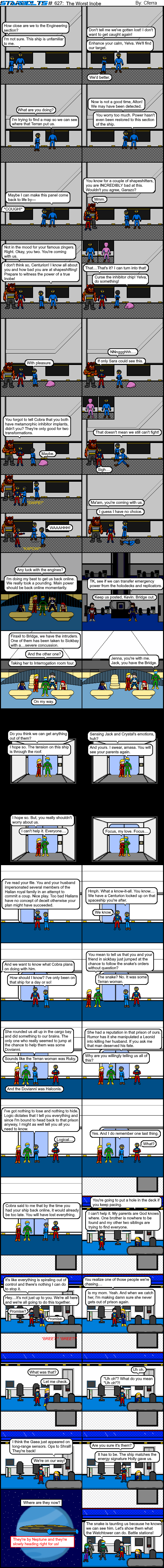 I figured a bit of levity was in order this week after a few comics where tragedy seemed to follow our heroes. Enter two criminal Inobe whose shapeshifting abilities have been severely limited as punishment for their crimes. Don’t get me wrong. They’re still dangerous and one Inobe on a starship can cause a lot of damage. However, these two have inhibitors implanted in their bodies that deny them the ability to change form or limit the form they can take. They turned into pink blobs when they beamed on board and that was the last time they were able to transform. Alton and Yelva didn’t think things through, did they?